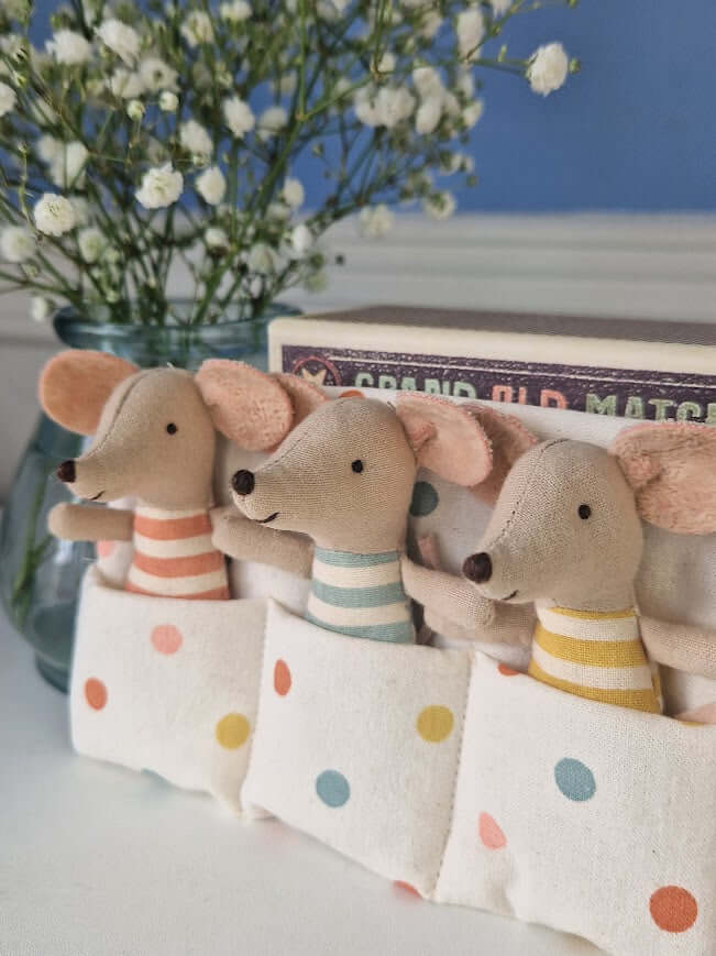 Now you can have 3 baby mice all at the same time. The Maileg triplet baby mice are carefully placed into their warm sleeping bag side by side. They come wearing stripy baby grows attached to their bodies in yellow, baby blue and soft pink.