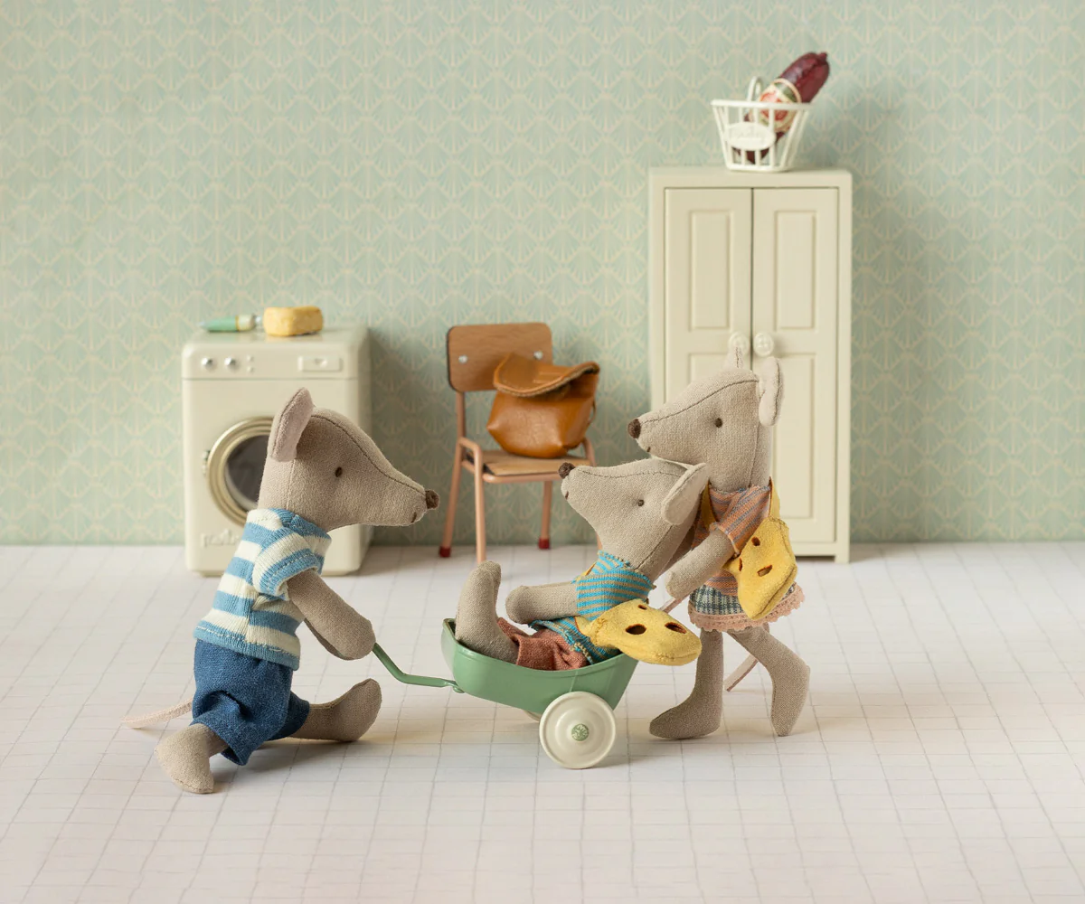 She wears a small cheese bag for all her personal belongings and has magnets in hands allowing her to hold onto metal items like the handles of the rocking horse or a tea cup. As well as other mice with magnetic hands! .