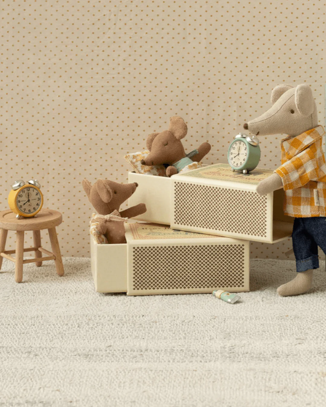A classic Maileg item. This baby mouse is ready for hours of play and sleeps tight in her little matchbox. The clothes are attached to her body and the bedlinen is made of soft fabrics with unique prints in beautiful colours.